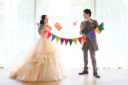 鮮やかなお花の中で純白のウェディングドレスとタキシードが映える一枚に
