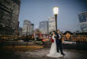 東京駅をバックにドレスをなびかせたショットご新婦様のヘアチェンジでガラリと印象が変わります
