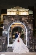 ご新婦様が空から舞い降りてきたような抱っこショットを、明かりが点灯した明治安田生命ビルの外壁前でお撮り致しました♡