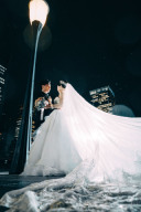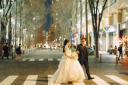 ライトが照らし始めた駅舎とビル街の前で誰よりも輝くおふたり