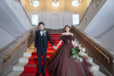 ミライザ大阪城のエントランスから始まる館内のフォトウェディング。アーチから見える景色とおふたりの姿がナチュラルで素敵に。