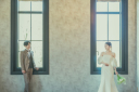 場所を少し変えて歴史を感じるステンドグラス風の窓からの自然光で優しい雰囲気のおふたり。