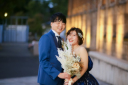 撮影の締めくくりは、とっておきのお気に入りのドレスとタキシードを身に纏ったこちらのショット。まるでお城の一角を思わせますね。