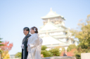ドレスへチェンジしミライザ大阪城入口でクラシカルな1枚。