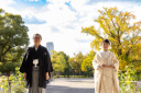 凛とした大阪城天守閣と大きく広がる青空とおふたりの姿は芸術的で絵になりますね