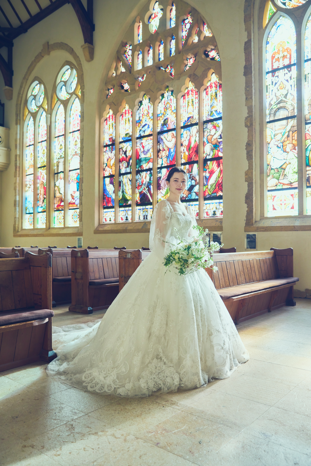 美しいアンティークステンドグラス輝く本格チャペルで残すふたりの姿 フォトウエディングだから残すことができるシーンには美しさとふたりらしさに溢れる1枚に。