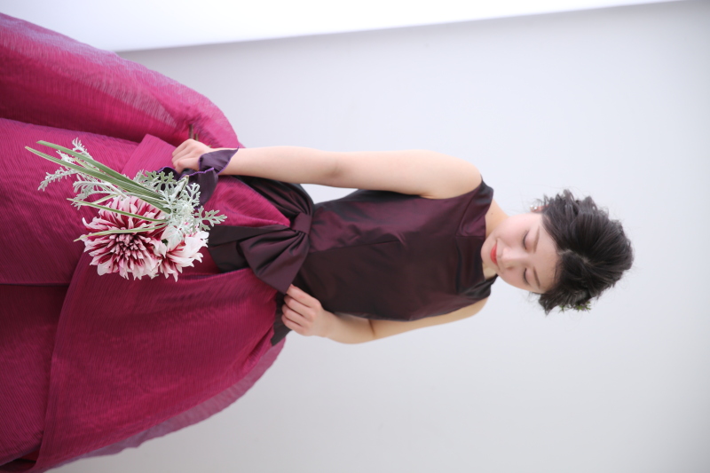 腰からふわっと広がるデザインが特徴的なノースリーブドレス。上下同系色のパープルでまとめられたバイカラーで大人かわいい印象に。