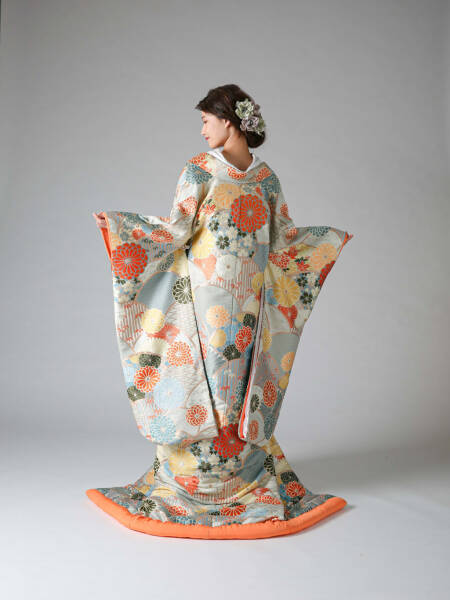 淡い水色に大小様々な菊があしらわれ、優しい色使いのため可愛い中にもおしゃれで個性的な1着です。