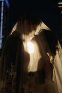 ベール越しの新婦様に新郎様がそっと手を添え、清らかなベールが舞い上がる前の美しい瞬間