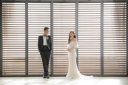 ダークにカッコよく決まる背景ですがお二人の優しい笑顔もよく映えます。白無垢がまた素敵です。