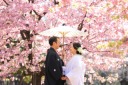 桜色にぴったりの色打掛ですね!新郎さんの紋付袴はチャコールグレーなので柔らかい雰囲気にぴったりです。