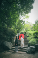 お天気が晴れて気持ちのいい撮影。待っているご新郎様の元へご新婦様が登場。