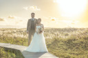 お嫁様に和装の『赤ライン』をお選びいただき、お婿様はおしゃれな『ベージュ』をセレクト。背景はコンクリート背景にユリの花を置き、上品で大人っぽい雰囲気に!