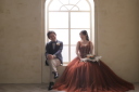 テラコッタカラーのドレスとグリーンのタキシード。衣装が綺麗に写し出される茶壁から!