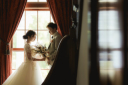 奥からの光と共に。グラデーションで綺麗に写し出される障子と、その間からお2人の姿を入れてみました!お嫁様の髪型と髪飾りも綺麗に写し出されますね♪