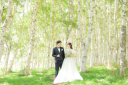 木に囲まれた道で、おふたりの後ろ姿を。緑がとても綺麗ですね♪