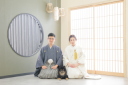障子や丸窓、竹のペンダントライトの背景でお2人の姿が際立つお写真!