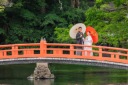 和装にぴったりの美しい池の橋。下には富士山の湧水が流れていてとても綺麗です