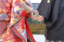 大好きが溢れるラブラブのおふたり♡ コーディネートされた新郎様の蝶ネクタイがばっちり。