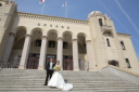 神社の向かい側にある並木道。新緑と後方にある桜を背景に、少しカジュアル要素もプラスして。