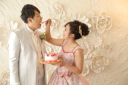 デザインの少ないシンプルなウエディングドレスにブラウンのタキシード。大人な組み合わせに、スタジオも落ち着いた雰囲気で。