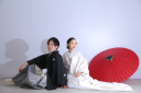 横に広く撮影できる大きな窓のスタジオ背景。座ることも出来るのでドレスのボリュームを活かして背中合わせで撮影しました。