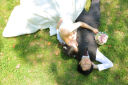 シンプル目なウエディングドレスからの色とデザインの入ったカラードレスへお色直し♪お二人のご希望でチャペルのガーデンでの撮影。