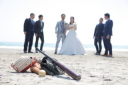 チャペルの絨毯にドレスを広げて寝ころびカット。新郎様のタキシードと絨毯の色味の相性もばっちり。眼を閉じてメイクもさりげなく映した一枚。
