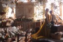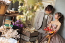 柄が多く黄色や朱色やカーキとカジュアルな色味の色打掛。ドライフラワーの背景でポージングもシンプルに手つなぎ。