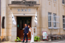 パフスリーブの目を引くビビットなオレンジカラードレス、カジュアルな色味のカーキ×ベージュのタキシード。お互いを引き立て合う魅力的なコーディネート。