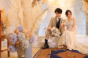 お持ち込みのドライフラワーのブーケで顔隠し、リクエストいただくことも多いポーズです。彩りきれいなロケーションをバックにお撮りしました。