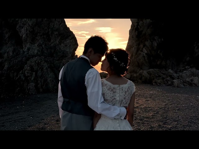 日出の石門で海ロケーションをしてきました。夕日が差し込む中のシルエット撮影はスタジオやチャペルでの自然光撮影とは一味違ったシックな印象に。