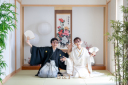 縁側に座って、今度は後ろからのショット。手前に和傘やイニシャルオブジェもいい感じ!