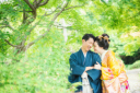 お二人よりそって、リラックスした笑顔です。木漏れ日がいいかんじ