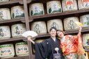 八坂庚申堂にて。色打掛は赤系を思い浮かべがちですが、黒だと新郎様と合わせたような雰囲気に。