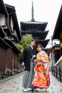 長岡天満宮に移動してロケーション撮影開始!新郎様、紋付き袴を黒から白に。紋付き袴も種類ございます、花嫁様だけでなく新郎様も楽しみましょう!