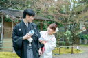 庭園の木々がフォトフレームのよう!その中に納まるお二人はニッコニコ♪