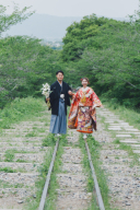 青紅葉が美しい大覚寺。花嫁様の白無垢は新緑によく映えます。