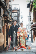 祇園からスタートです!夏の暑さを吹き飛ばすような鮮やかな色打掛を選ばれています。
