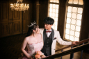 解放感のある、邸宅で手を取り合って愛を誓うシーン。スッと伸びたおふたりの姿勢が美しいですね。