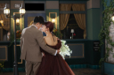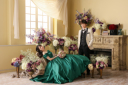 シャンデリアの下で並び、窓の向こうを見つめる二人の姿が静かな時間を感じさせる