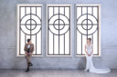 重厚な背景の中で寄り添う二人。手にした赤い薔薇のブーケが、画面に落ち着きを加えている
