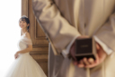 チャペルの白さとドレスの色味が映えます優しく差し込む光がお二人を照らす