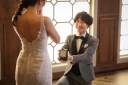 古い町並みと白いベールが重なり、和と洋が緩やかに調和した一枚に仕上がっている