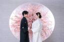 桜の前ボケ越しに、並んで腰かける二人の穏やかな表情が映える構図