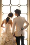 こちらも結婚式風のお写真。見つめ合った二人の表情が印象的な一枚