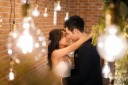 花咲く窓辺で新婦様を抱きしめる新郎様♪かわいらしいセットの中でもロマンティックなおふたりの雰囲気が印象的ですね!