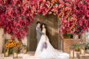 いつものおふたりを切り取ったような1枚♪色白なご新婦様に背景の淡い色のお花が、よくお似合いです♡