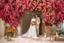 フラワーゲートとブーケが色鮮やかで、新婦様の笑顔がとても素敵な一枚です