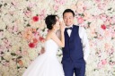 柔らかい陽射しのようなライティングと、鮮やかなフラワーゲートに包まれたお二人がとっても素敵な1枚。